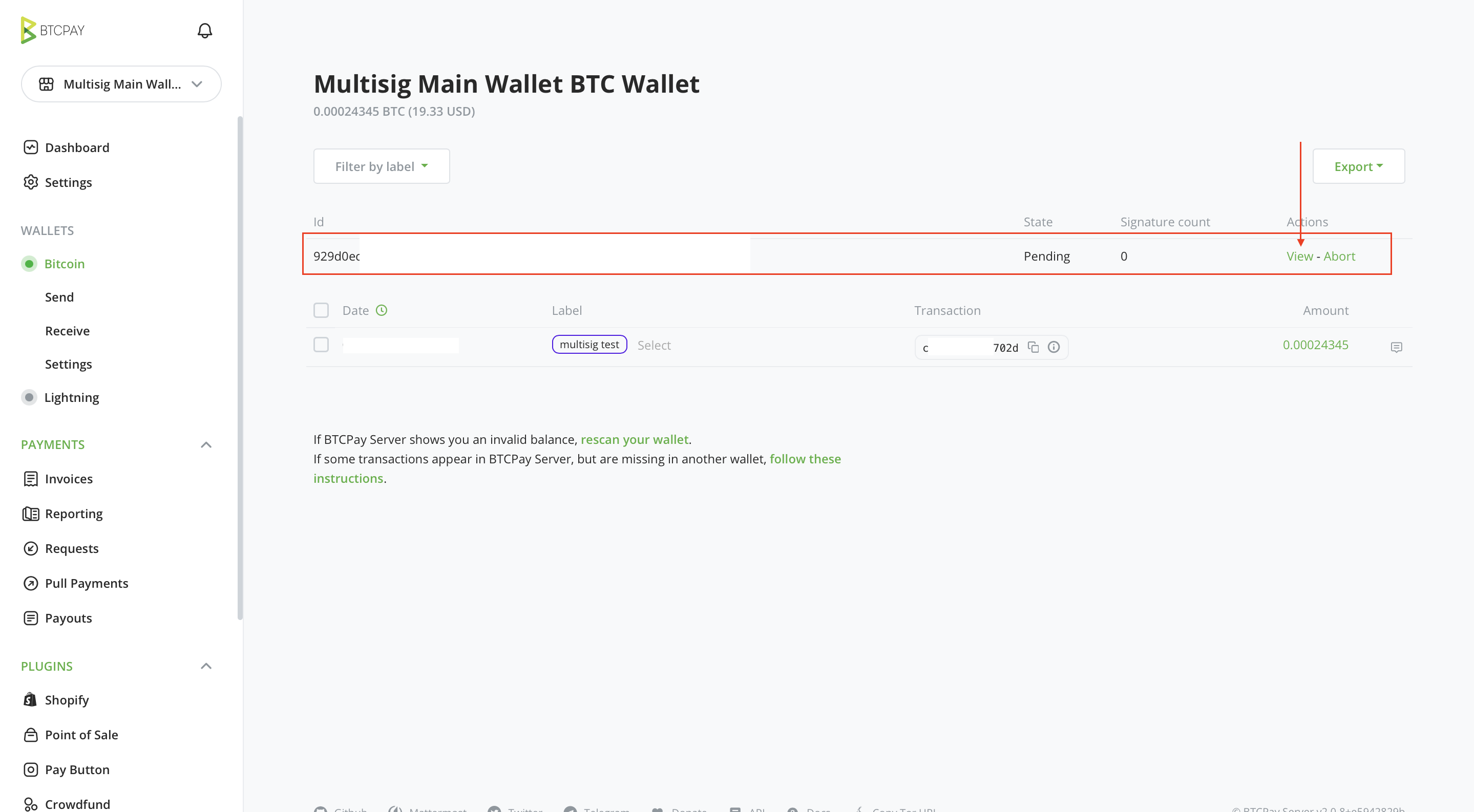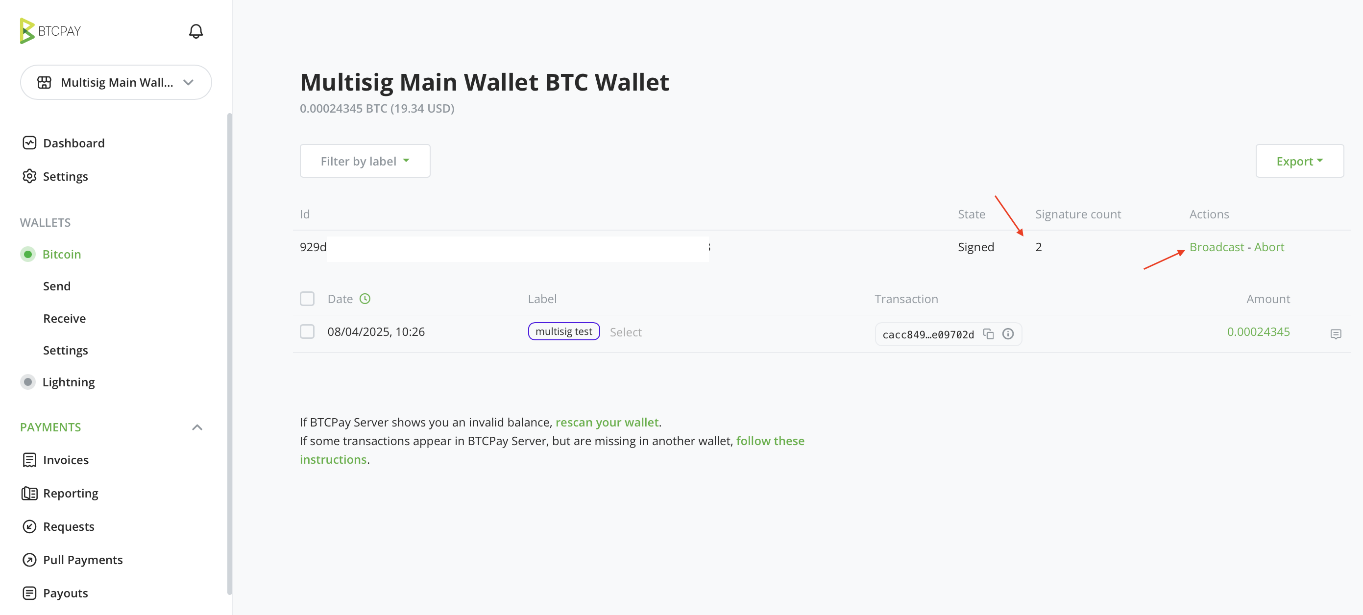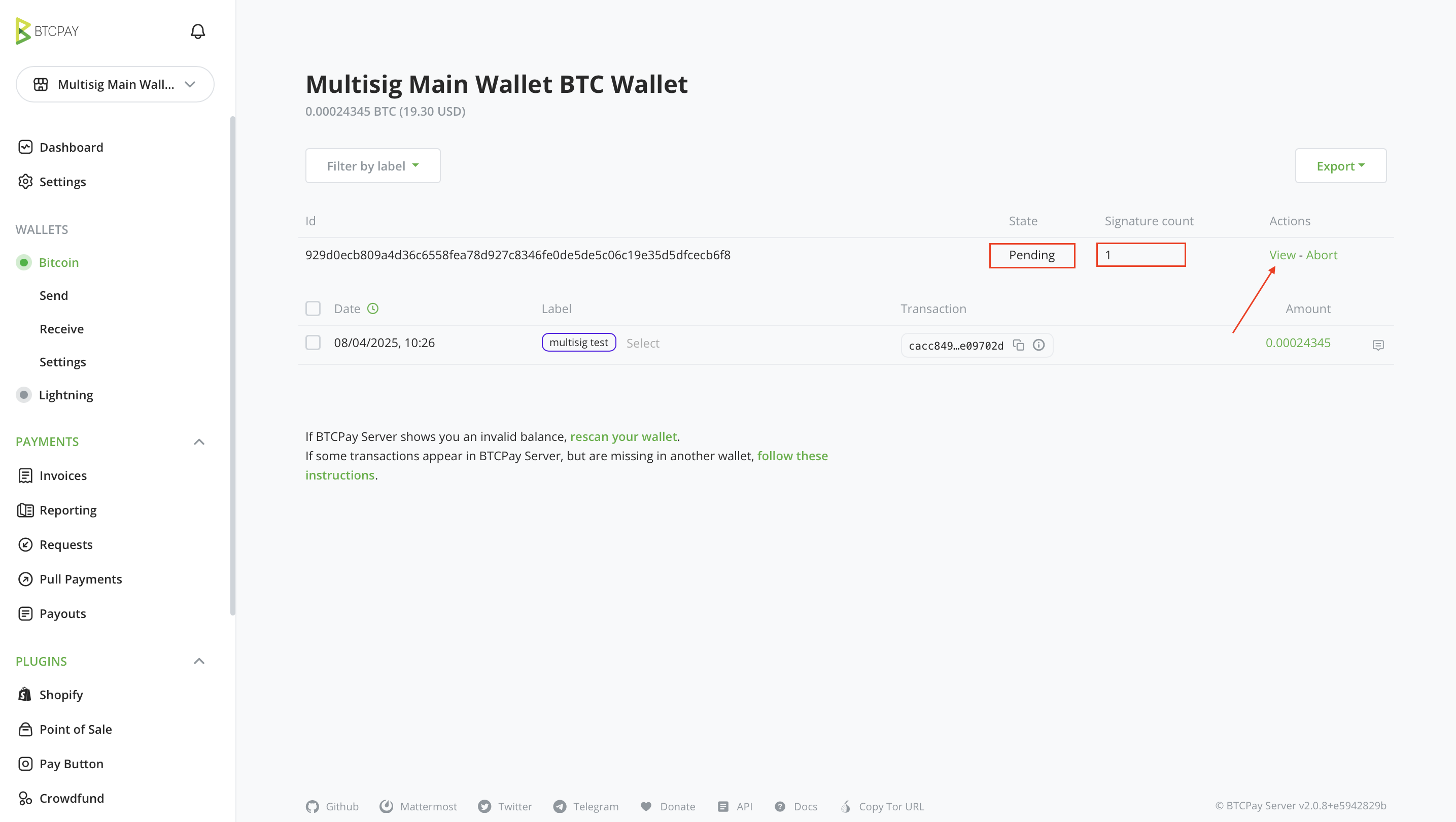 これで、BTCPay Server を使った最初のマルチシグトランザクション送信が完了です。