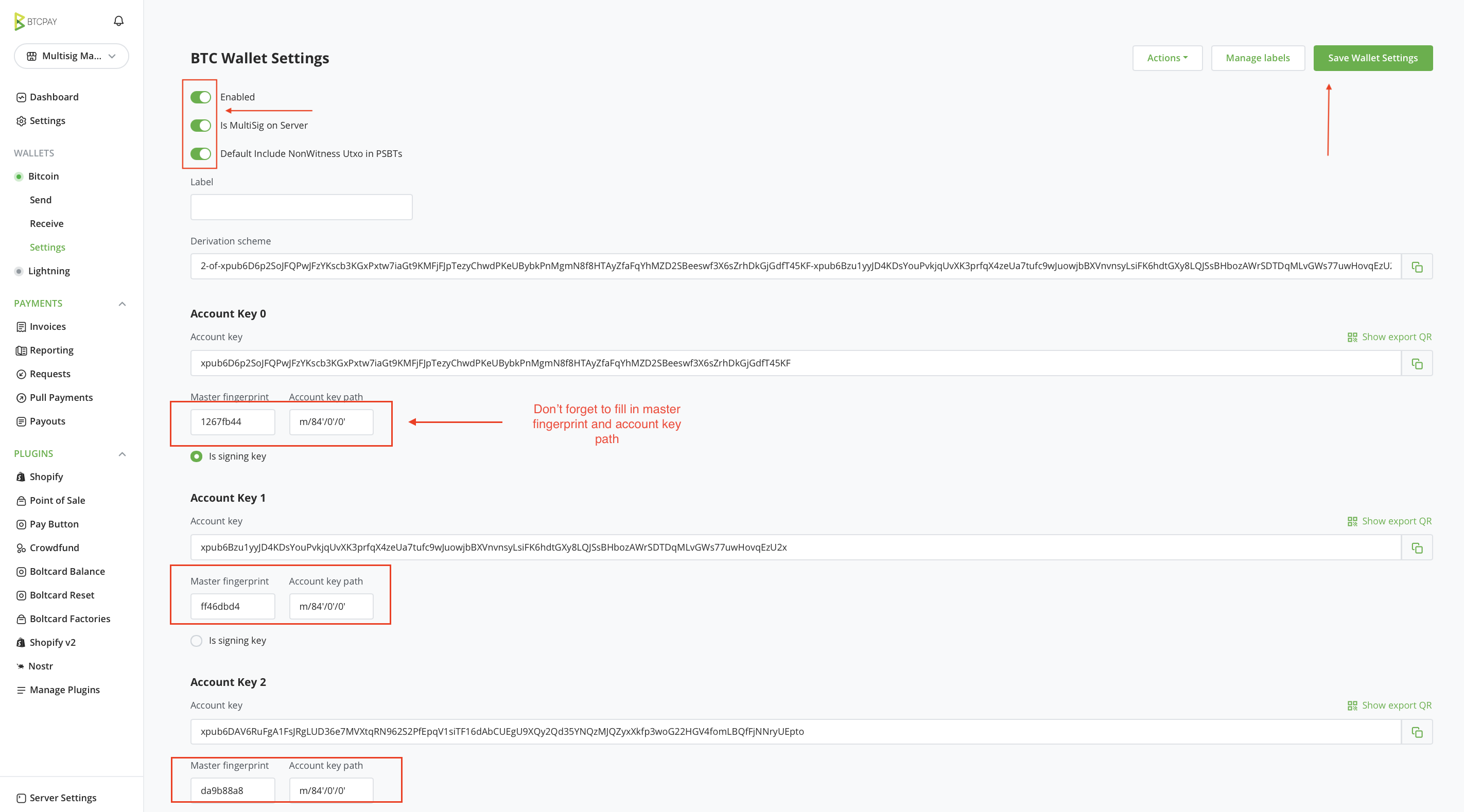 Wallet Settingsに移動します。Multisig on Serverオプションを有効にします。- 各鍵の